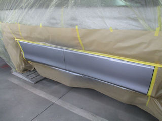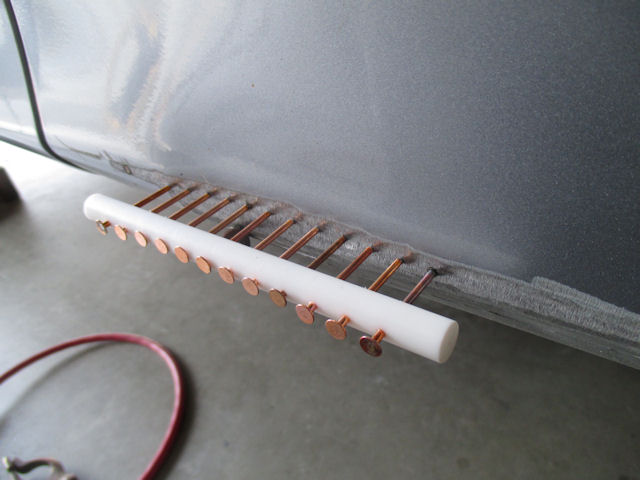ハンマーで膨らみを叩きながら、凹みをスタッドで引っ張ります~。