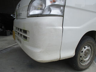 幸いカラー樹脂バンパー。塗装じゃなくて素地が白い今時のバンパー。