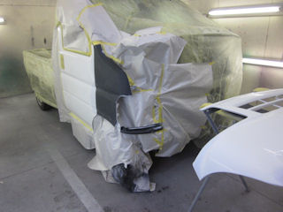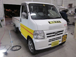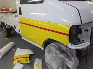 この軽トラは昭和シェルカラーなのでカッティングシート貼りがあり、