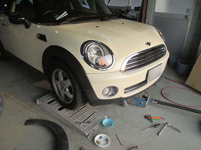 フェンダーは脇に引っ張って出幅を合わせて塗装割れの修理。