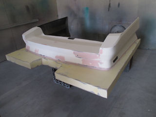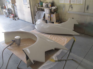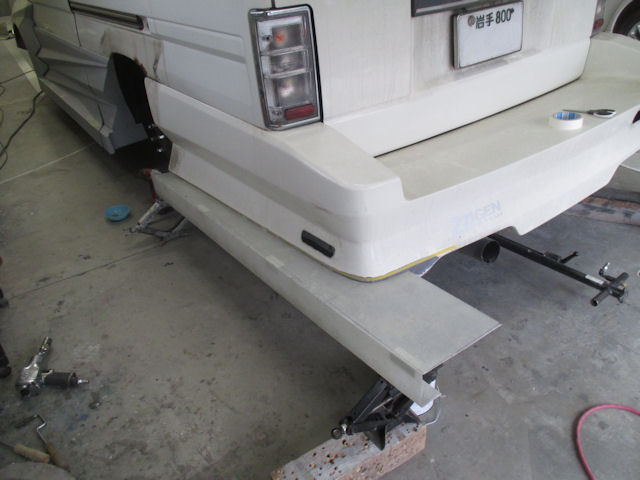 週末、運動会が中止になったので出勤、 仕事入れたら忙しくなった上に連日の雨、 久々の更新となってしまいました(^^; やっと晴れましたね~、ってすぐ梅雨になっちゃうんでしょうが(><) さて、24バニの続きです~。 割れだらけのフロントバンパーもパテ研ぎ、 曲がってたコーナーパネルを直し、 不要な穴埋めツートンライン消し、 サフェ入ります~。 続きましてリアバンパーリップ。 サイドと要領は同じです。 作ったFRPの板を組んでいきます。 長すぎると家に入られないみたいなんで、 程よい長さ&後ろに向けて若干上げです。 定番のM型、センターだけ角度付けてみました。 パテ処理です~、割れと穴埋めも一緒に。 サフェが入ります~。 リアバンパーに合わせて加工したバーフェンもサフェ。 バーフェンは切っただけじゃなく細かい加工が施されてますが、 撮ってない・・・。 集中してる証拠ですね(^^; アンダーエアロだけで1ヶ月くらいは掛かってるんじゃないすかね~。 お次は車体に入ります~。 で、続きはまた後日に(^^;