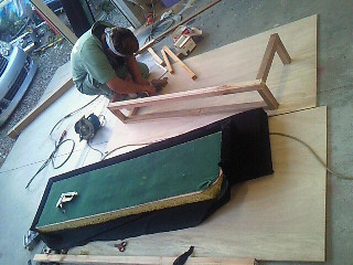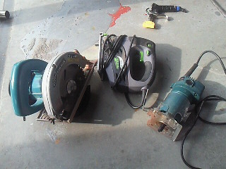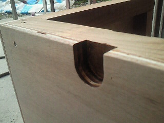 土台にトリマーで溝を付け、パイプを乗せられるようにします。