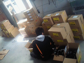 材料屋さん登場でトラック満載のダンボールの山。